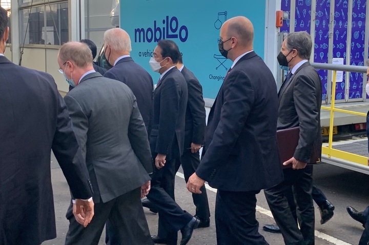 [글래스고=뉴시스]이지예 특파원=기시다 후미오 일본 신임 총리(가운데 안경과 흰마스크 착용) 와 조 바이든 미국 대통령(기시다 왼쪽 흰머리에 검은 마스크) 이 2일(현지시간) 영국 글래스고에서 열린 제26차 기후변화협약 당사국총회(COP26)에서 주요 7개국(G7) 회의장으로 함께 이동하고 있다. 2021.11.2.