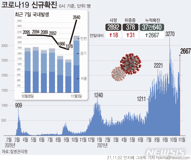 [서울=뉴시스] 3일 0시 기준 코로나19 신규 확진자 수가 2600명대까지 급증했다. 3일 만에 2000명대이자 '단계적 일상회복' 전환 이틀 만이다. 사망자는 18명 늘어 누적 2892명이다. (그래픽=안지혜 기자)