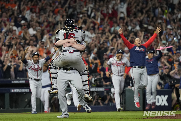 [휴스턴=AP/뉴시스] 애틀랜타 브레이브스 선수들이 2일(현지시간) 미 텍사스주 휴스턴의 미닛메이드 파크에서 열린 2021 메이저리그 휴스턴 애스트로스와의 월드시리즈(7전4선승제) 6차전을 승리, 우승하며 환호하고 있다. 애틀랜타는 6차전에서 휴스턴을 7-0으로 완봉, 시리즈 전적 4승 2패로 26년 만에 월드시리즈 우승을 차지했다. 2021.11.03.