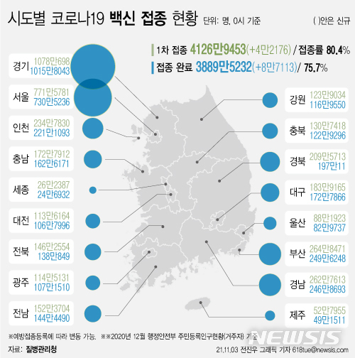 [서울=뉴시스] 3일 코로나19 예방접종 대응 추진단에 따르면 시도별 누적 1차 접종자 수는 경기도가 1078만698명으로 가장 많고, 이어 서울 771만5781명, 부산 264만8471명, 경남 262만7613명 등이다. 지역별로 1차 접종률이 높은 곳은 전남 82.8%로 가장 높다. (그래픽=전진우 기자)