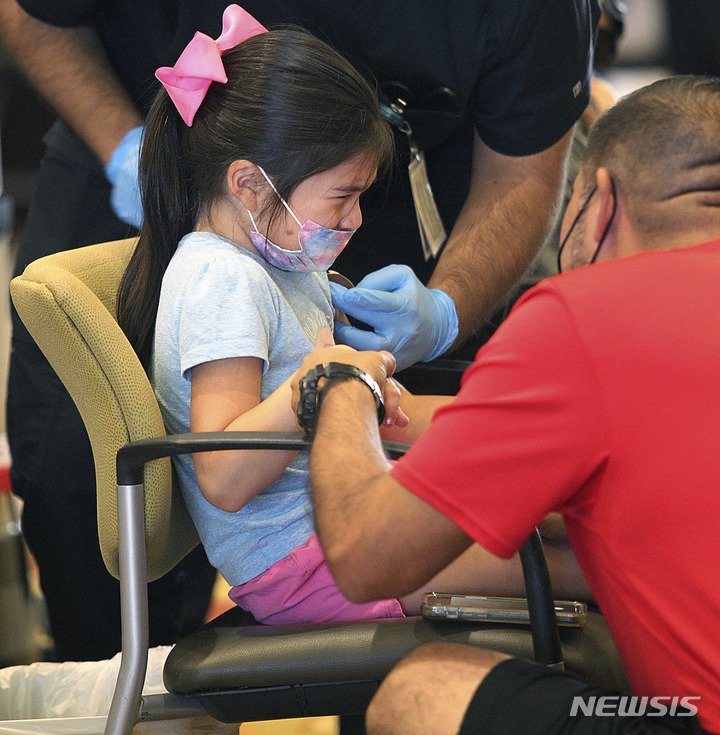 [에딘버그=AP/뉴시스] 3일(현지시간) 미 텍사스주 에딘버그의 에딘버그 콘퍼런스 센터에서 한 5세 소녀가 아빠 손을 붙잡고 화이자 백신을 접종하면서 울고 있다. 미국 질병통제예방센터(CDC)가 전날 5∼11세 어린이를 대상으로 화이자-바이오엔테크의 코로나19 백신 접종을 승인하면서 이 연령대의 어린이들이 백신 접종을 시작했다. 2021.11.04.
