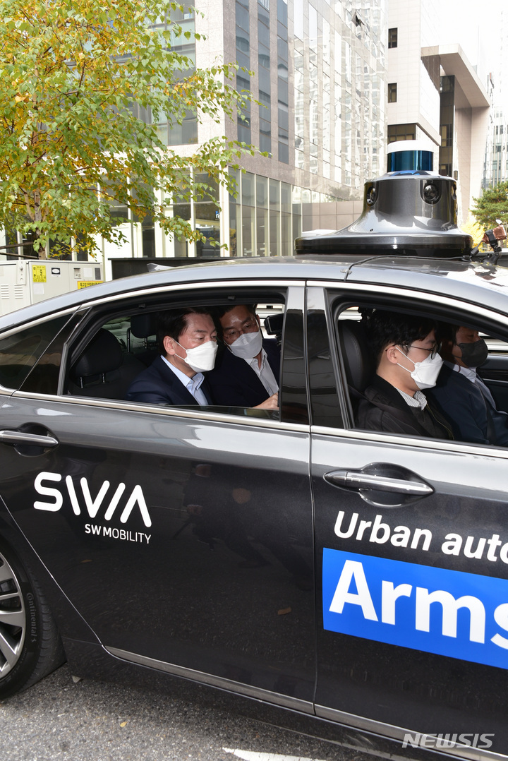 [안양=뉴시스] 국회사진기자단 = 대선 출마를 선언한 안철수 국민의당 대표가 4일 경기 안양시 자율주행 벤처기업 에스더블유엠을 방문해 김기혁 대표의 설명을 들으며 자율주행차량을 시승하고 있다. 2021.11.04. [email protected]