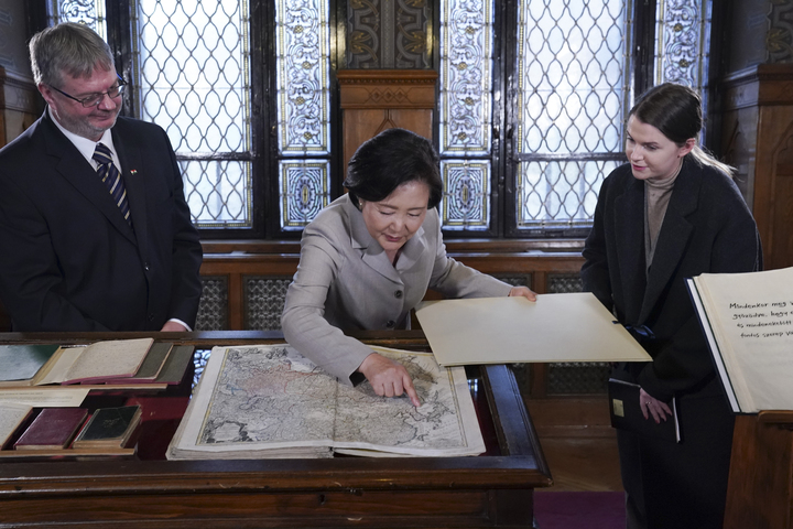 [서울=뉴시스] 전진환 기자 = 문재인 대통령은 4일(현지시간) 유럽 순방 일정을 마치며 사회관계망서비스(SNS) 계정에 '헝가리 방문 중 아내가 국립국가기록원에서 동해가 표시된 고지도를 기증받고, 120년 전 한국과 헝가리 사이를 잇는 귀중한 기록을 확인했습니다', '이번에 야노쉬 대통령, 오르반 총리와 양국관계를 ‘전략적 동반자 관계’로 격상했고, 우리는 함께 도약할 것입니다'라며 끝으로 'G20 정상회의와 COP 26에서 세계가 우리를 주목하고 있음을 새삼 느꼈고, 높아진 국격만큼 국민의 삶의 질도 높아지도록 노력하겠습니다'라는 글을 남겼다. 사진은 김정숙 여사가 3일(현지시각) 오후 헝가리 부다페스트 국립국가기록원에서 '러시아 제국과 타타르 세계'(1730년 제작)의 이름을 가진 고지도를 보며, 헝가리 말로 '소동해'라고 기록된 부분을 확인하고 있다. 2021.11.05. [email protected]
