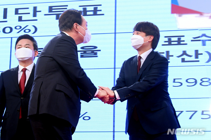 [서울=뉴시스] 최진석 기자 = 국민의힘 제20대 대통령 선거 후보에 선출된 윤석열 전 검찰총장이 5일 오후 서울 용산구 백범김구기념관에서 열린 제2차 전당대회에서 개표결과 발표 후 이준석 대표와 악수를 하고 있다. (공동취재사진) 2021.11.05. [email protected]
