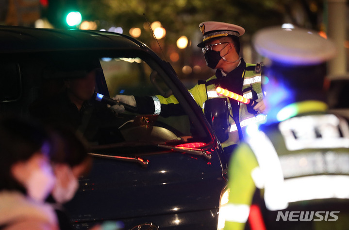 [서울=뉴시스] 백동현 기자 = 6일 새벽 서울 송파구 방이삼거리에서 경찰이 비접촉식 단속기를 이용해 음주운전 단속을 하고 있다. 2021.11.06. [email protected]