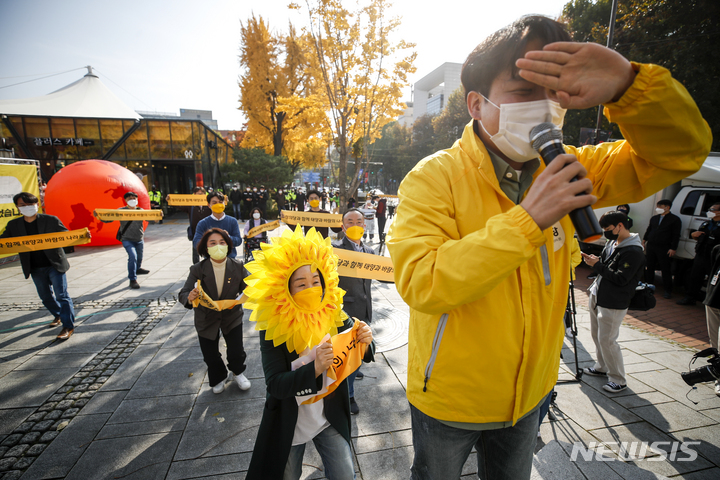 [서울=뉴시스] 정병혁 기자 = 심상정 정의당 대선후보가 6일 오후 서울 종로구 마로니에공원에서 열린 기후정의 세계공동행동 정의당 정당연설회에서 기후위기 꽃이 피었습니다 게임을 하고 있다. 2021.11.06. [email protected]