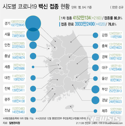 [서울=뉴시스] 8일 코로나19 예방접종 대응 추진단에 따르면 시도별 누적 1차 접종자 수는 경기도가 1085만2226명으로 가장 많고, 이어 서울 775만5977명, 부산 266만2516명, 경남 264만2617명 등이다. 지역별로 1차 접종률이 높은 곳은 전남 83.4%로 가장 높다. (그래픽=전진우 기자)