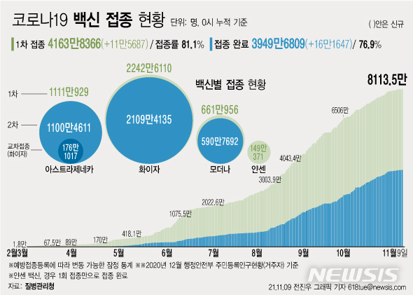 [서울=뉴시스] 9일 코로나19 예방접종대응추진단에 따르면 전날 8일 1차 접종자는 11만5687명 늘어 누적 4163만8366명이다. 전체 국민의 81.1%가 1차 접종을 마쳤다. 접종 완료자는 전체 인구의 76.9%인 3949만6809명이다. (그래픽=전진우 기자)
