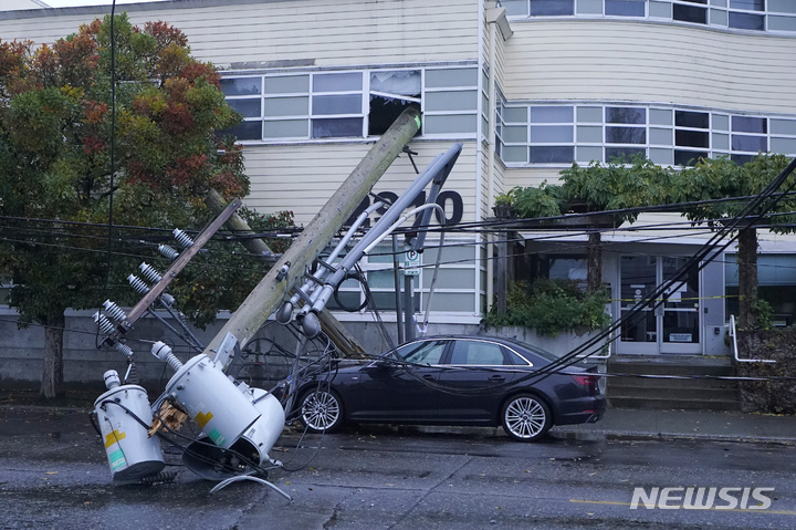 [시애틀=AP/뉴시스] 9일(현지시간) 미 워싱턴주 시애틀에 폭풍우가 몰아친 후 거리의 전신주가 부러지면서 한 건물 유리창을 뚫고 박혀 있다. 강풍을 동반한 비가 이 지역을 통과하면서 시애틀 시내와 워싱턴주 해안 지역 등에 강풍 주의보가 내려졌다. 2021.11.10.