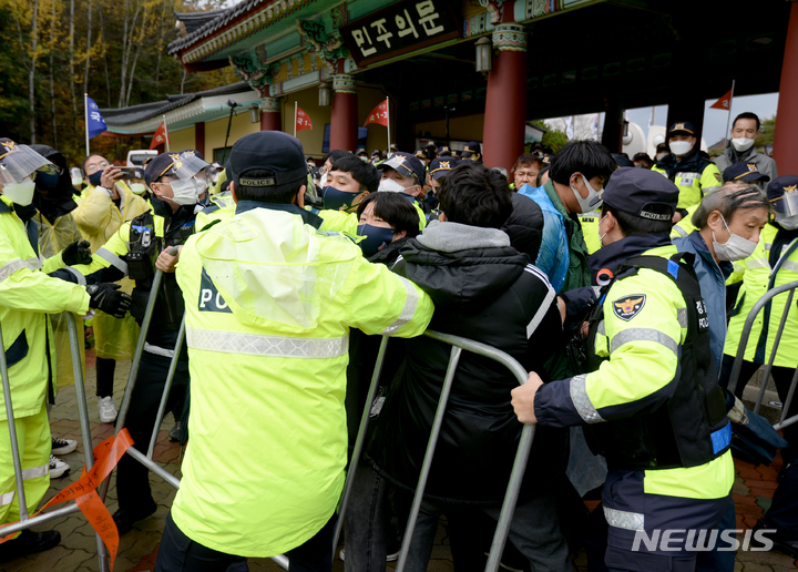 [광주=뉴시스] 김혜인 기자 = 10일 오전 광주 북구 운정동 국립5·18민주묘지에서 대학생들이 경찰 보호 펜스를 철거하며 경찰과 물리적 충돌을 빚고 있다. [email protected]