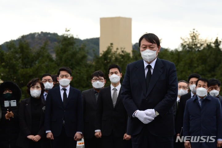 [김해=뉴시스] 차용현 기자 = 국민의힘 윤석열 대통령후보가 11일 오후 경남 김해시 봉하마을을 찾아 고(故) 노무현 전 대통령 묘소에 참배하고 있다. 2021.11.11. [email protected]