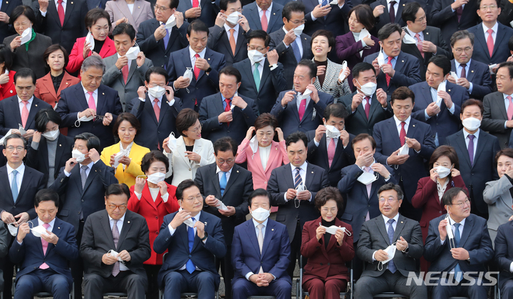 단체사진 촬영 위해 마스크 벗는 국회의원들