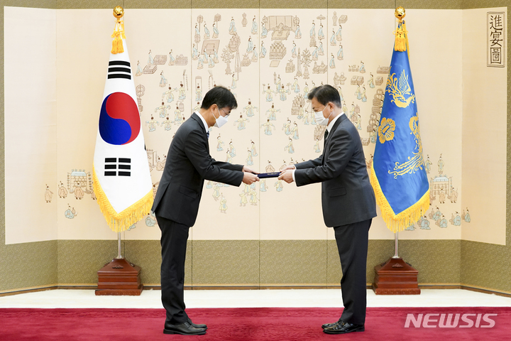 [서울=뉴시스] 전진환 기자 = 문재인 대통령이 12일 오전 청와대 본관 접견실에서 최재해 신임 감사원장에게 임명장을 수여하고 있다. 2021.11.12. [email protected]
