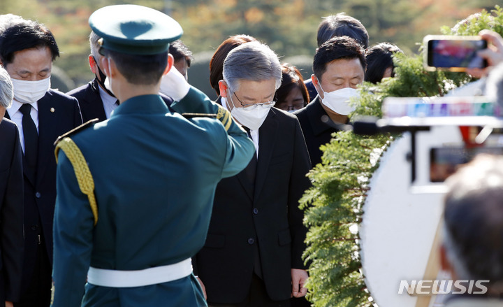[부산=뉴시스] 하경민 기자 = 이재명 더불어민주당 대선 후보가 13일 오전 부산 남구 유엔기념공원을 방문, 6·25전쟁 유엔군 전몰장병 모역에 헌화한 뒤 묵념하고 있다. 2021.11.13. [email protected]