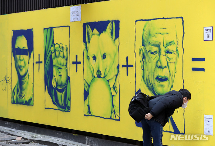 [서울=뉴시스] 백동현 기자 = 13일 오후 서울 종로구 한 중고서점 건물 외벽에 운석열 국민의힘 대선 후보와 관련한 벽화가 그려져 있다. 2021.11.13. [email protected]