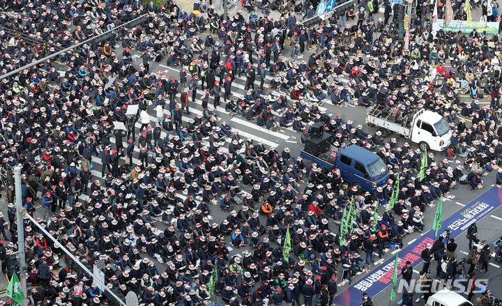 [서울=뉴시스] 백동현 기자 = 전국민주노동조합총연맹(민주노총)이 13일 오후 서울 동대문 사거리에서 전국노동자대회를 열고 있다. 2021.11.13. [email protected]