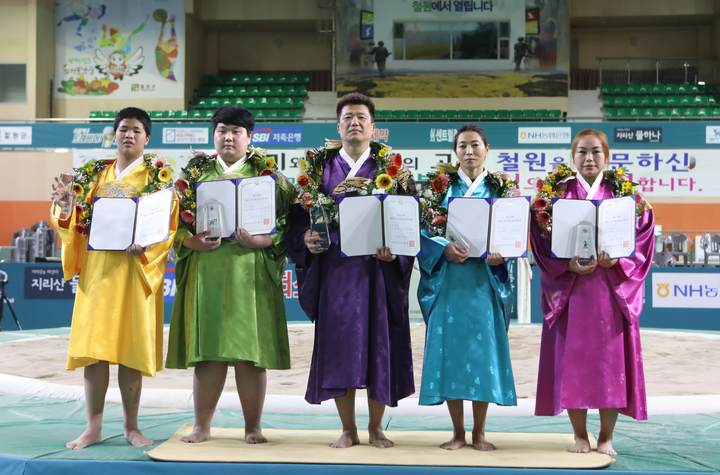 [서울=뉴시스] 박주성 기자 = 13일 강원도 철원군 철원실내체육관에서 열린 ‘대통령배 2021 전국씨름왕선발대회’ 체급별 씨름왕에 등극한 선수들(박정훈, 김웅인, 박문수, 노은수, 양현수 순)이 기념사진을 찍고 있다. (사진=대한씨름협회 제공). 2021.11.14. [email protected] *재판매 및 DB 금지