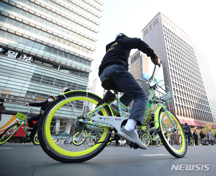 [서울=뉴시스] 박미소 기자 = 15일 오전 서울 중구 청계광장에서 관계자들이 포르쉐 드림 아트 따릉이를 시승하고 있다. 포르쉐 드림 아트 따릉이는 서울문화재단과 포르쉐코리아 후원으로 진행한 친환경 예술도시 프로젝트의 일환으로 시민 공모를 통해 디자인이 선정됐다. 2021.11.15. [email protected]