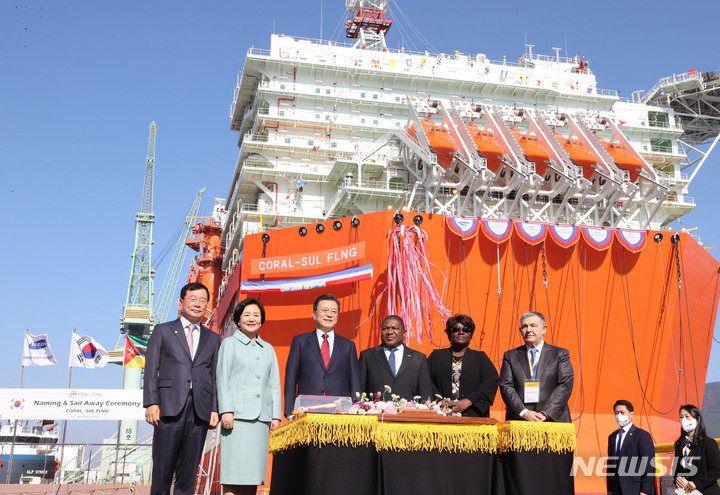 [거제=뉴시스] 전진환 기자 = 문재인 대통령 내외와 필리프 뉴지 모잠비크 대통령 내외가 15일 경남 거제시 삼성중공업 거제조선소에서 열린 한-모잠비크 부유식 해양 LNG 액화 플랜트(FLNG)선 출항 명명식에서 명명줄을 자른 뒤 코랄호를 배경으로 기념촬영하고 있다. 2021.11.15. [email protected]