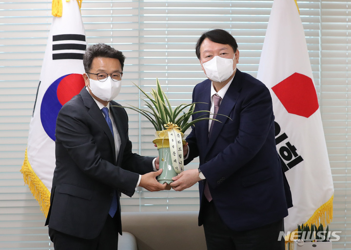 [서울=뉴시스] 국회사진기자단 = 윤석열 국민의힘 대선 후보가 15일 서울 여의도 국민의힘 당사에서 이철희 청와대 정무수석으로부터 문재인 대통령이 보낸 대선 후보 선출 축하난을 받고 있다. 2021.11.15. [email protected]