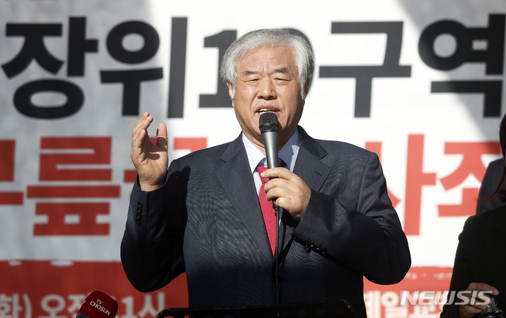 [서울=뉴시스] 홍효식 기자 = 전광훈 사랑제일교회 목사가 16일 오전 서울 성북구 사랑제일교회 앞에서 '불법명도 집행한 장위10구역 장순영과 서울시장은 무릎꿇고 사죄하라' 긴급 기자회견을 하고 있다. 2021.11.16. [email protected]