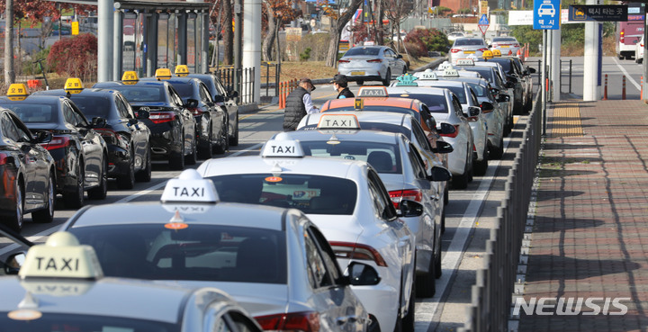 [서울=뉴시스] 권창회 기자 = 16일 오후 서울 강남구 수서역 인근 택시승강장에서 택시가 손님들을 기다리고 있다. 단계적 일상 회복(위드 코로나) 시행으로 심야 시간 택시 대란이 심해지자 서울시는 이날 택시 공급 확대를 위해 연말까지 밤 시간대 개인택시 3부제를 해제한다고 밝혔다. 2021.11.16. [email protected]
