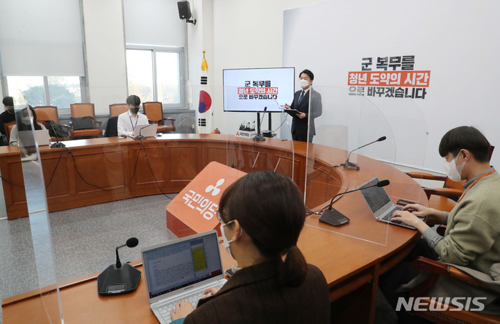 [서울=뉴시스] 최진석 기자 = 국민의당 안철수 대선후보가 17일 오전 서울 여의도 국회에서 군 복무 관련 청년 공약 2호를 발표하고 있다. (공동취재사진) 2021.11.17. [email protected]