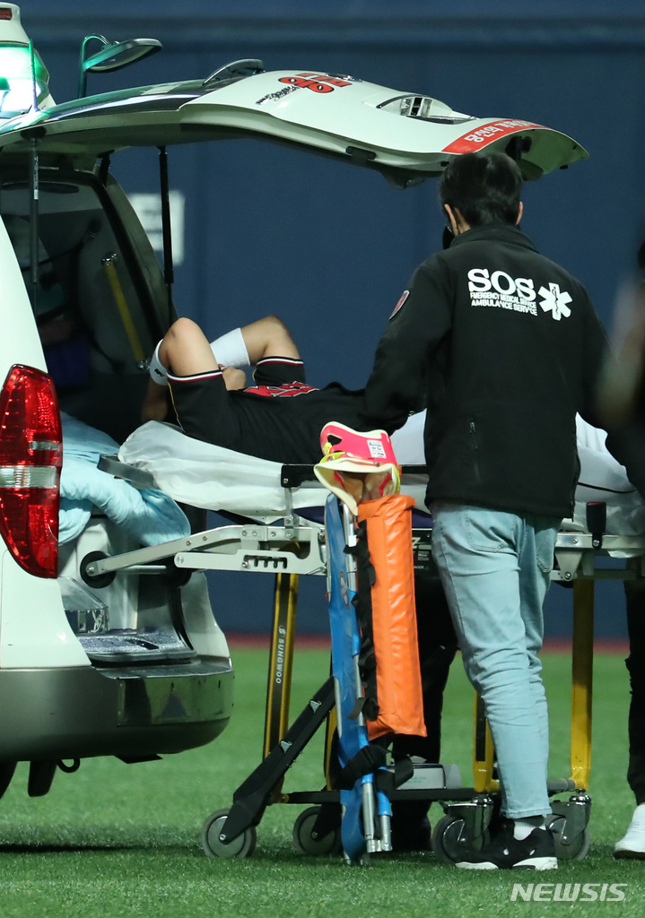 [서울=뉴시스] 이영환 기자 = 17일 오후 서울 구로구 고척스카이돔에서 열린 2021 KBO 한국시리즈 두산 베어스와 KT 위즈의 3차전 경기, 8회말 무사 1루에서 KT 2루수 박경수가 두산 안재석의 타구를 잡으려다 부상을 당해 구급차에 오르고 있다. 2021.11.17. [email protected]