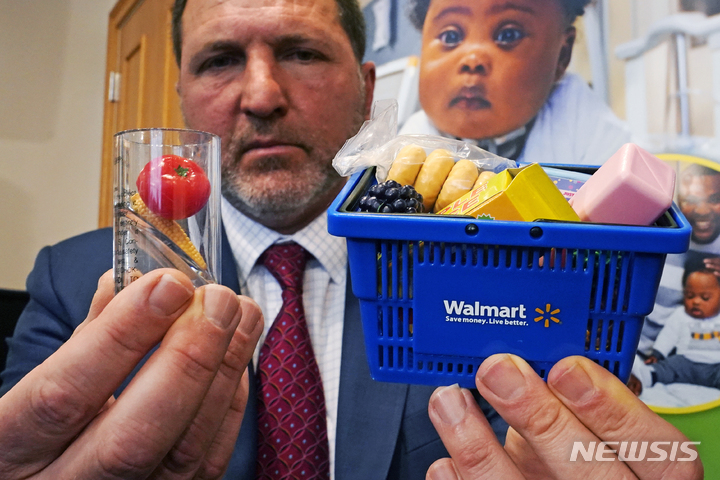 [보스턴=AP/뉴시스] 어린이 보호를 위한 비영리단체 '유해 장난감에 맞서는 세상'(World Against Toys Causing Harm, WATCH)의 제임스 슈와츠 이사가 17일(현지시간) 미 매사추세츠주 보스턴의 한 어린이 병원에서 '최악의 장난감 10종' 후보를 공개하는 기자회견을 열고 장난감 월마트 쇼핑 바구니와 질식 테스트 측정기를 들고 있다. 이날 발표한 장난감 목록에는 어린이의 질식을 유발할 수 있는 작은 장신구가 달린 장난감, 넘어질 수 있는 바퀴 달린 장난감, 눈을 다치게 할 수 있는 발사체 발사 장난감 등이 포함됐다. 2021.11.18.