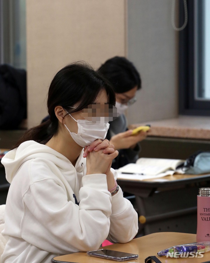 [서울=뉴시스] 사진공동취재단 = 2022학년도 대학수학능력시험(수능시험)이 전국 86개 시험지구 1,300여 시험장에서 일제히 열린 18일 오전 서울 중구 이화여자외국어고등학교 (제15시험지구 제20시험장)에서 시험장에 입실한 수험생이 1교시 시험을 앞두고 기도를 하고 있다. 2021.11.18. [email protected]