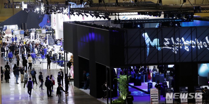 [부산=뉴시스] 하경민 기자 = 국제 게임 전시회인 '지스타 2021'가 열린 18일 부산 해운대구 벡스코 제1전시장을 찾은 관람객들이 최신작 게임을 즐기거나 게임사 이벤트에 참여하고 있다. 40개국 672개사 참가한 이번 행사는 오는 21일까지 계속된다. 2021.11.18. [email protected]