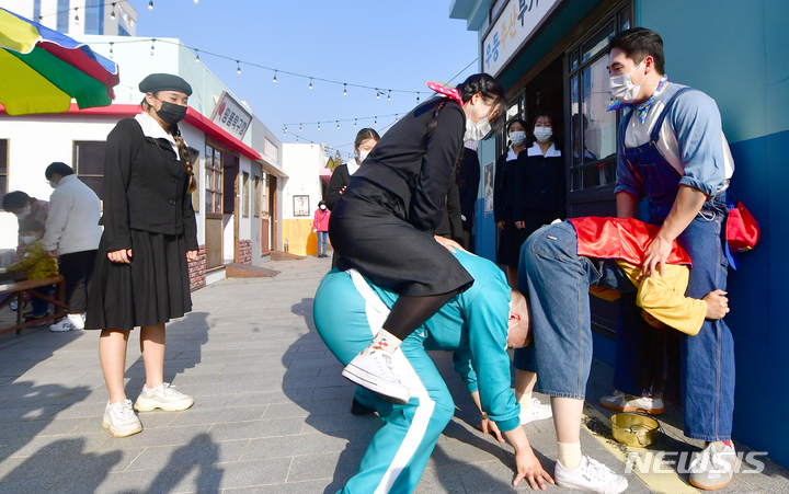 [광주=뉴시스] 류형근 기자 = '힐링 YES' 주제의 18회 추억의 충장축제가 18일 오후 광주 동구 5·18민주광장 일대에서 막을 올린 가운데 추억의 테마거리에서 배우들이 1970~1980년대 골목길 놀이였던 '말뚝박기'를 재연하고 있다. 2021.11.18. [email protected]