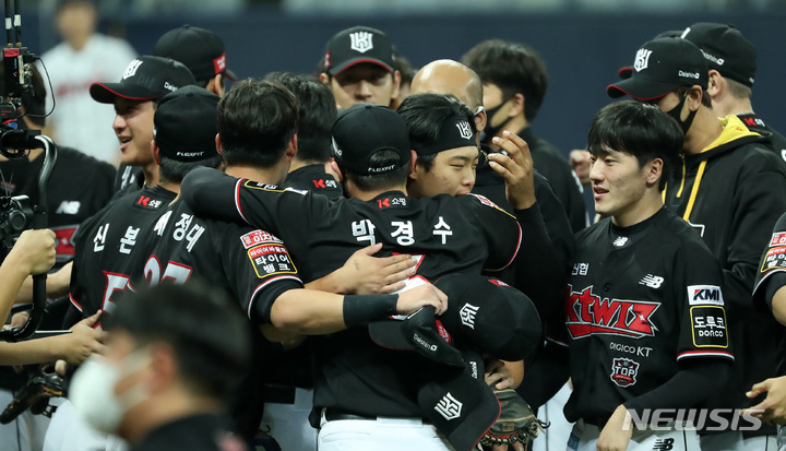 [서울=뉴시스] 이영환 기자 = 18일 오후 서울 구로구 고척스카이돔에서 열린 2021 KBO 한국시리즈 두산 베어스와 KT 위즈의 4차전 경기, 8 대 4로 승리를 거둬 4연승으로 한국시리즈 우승을 차지한 KT 선수들이 기뻐하고 있다. KT는 1군 입성 후 7년만에 처음으로 페넌트레이스 및 한국시리즈 통합우승을 달성했다. 2021.11.18. [email protected]