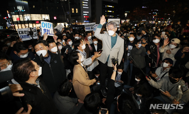 [대전=뉴시스] 전신 기자 = 이재명 더불어민주당 대선 후보가 19일 대전 서구 갤러리아백화점 타임월드 일대에서 시민들과 인사하고 있다. 2021.11.19. [email protected]