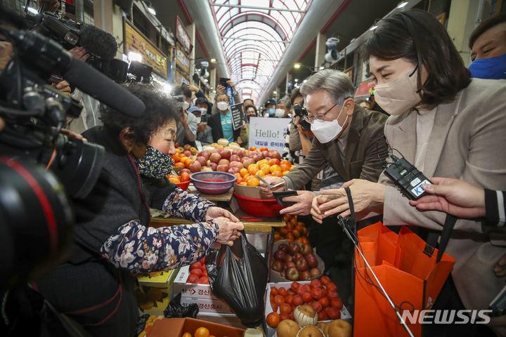 [청주=뉴시스] 정병혁 기자 = 이재명 더불어민주당 대선 후보와 부인 김혜경 씨가 21일 오후 충북 청주시 육거리종합시장을 찾아 과일을 구매하고 있다. 2021.11.21. [email protected]