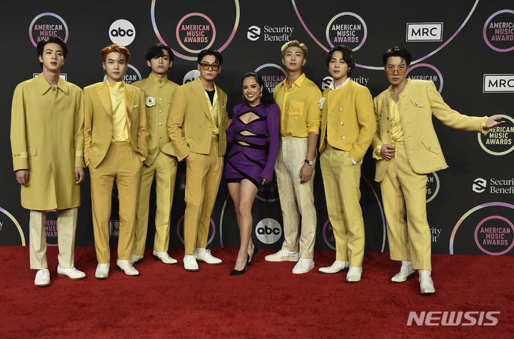 [로스앤젤레스=AP/뉴시스] 그룹 방탄소년단(BTS)이 21일(현지시간) 미 캘리포니아주 로스앤젤레스의 마이크로소프트 극장에서 열린 ‘아메리칸 뮤직 어워즈’(American Music Awards·AMA)에서 '올해의 아티스트''페이버릿 팝송''페이버릿 팝 듀오·그룹' 등 3관왕을 차지한 후 '페이버릿 여성 라틴 아티스트' 상을 받은 베키지(가운데)와 기념 촬영을 하고 있다. 2021.11.22.