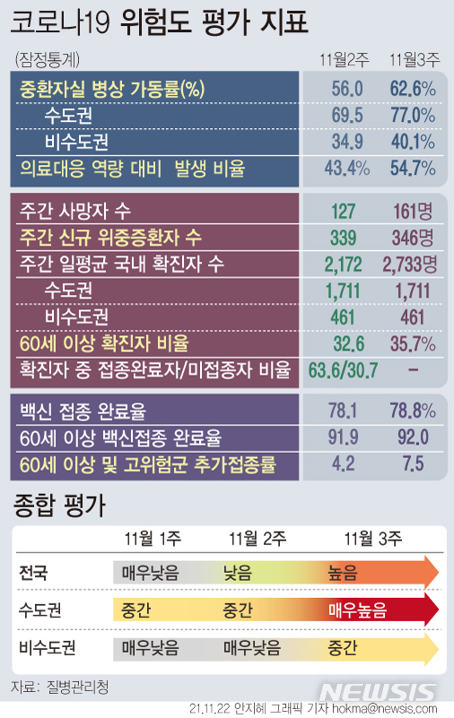 [서울=뉴시스] 22일 질병관리청은 위험도 평가 지표를 바탕으로 이달 14일부터 20일까지 11월 3주차 주간 상황을 처음 평가했다. 전국은 '높음', 수도권은 '매우 높음', 비수도권은 '중간'으로 조사됐다. (그래픽=안지혜 기자)