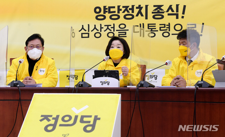 [서울=뉴시스] 최진석 기자 = 심상정(왼쪽 두번째) 정의당 대선 후보가 22일 오전 서울 여의도 국회에서 열린 선대위회의에서 발언을 하고 있다. (공동취재사진) 2021.11.22. [email protected]