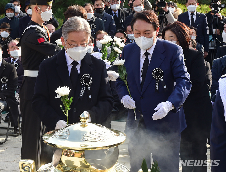 [서울=뉴시스] 국회사진기자단 = 더불어민주당 이재명(왼쪽), 국민의힘 윤석열 대선 후보가 22일 서울 동작구 국립서울현충원 내 김영삼 전 대통령 묘역에서 열린 6주기 추모식에서 헌화를 하고 있다. 2021.11.22. [email protected]