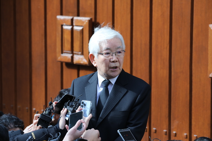 [서울=뉴시스] 박미소 기자 = 전두환 전 대통령이 사망한 23일 오전 서울 서대문구 자택 입구에서 민정기 전 비서관이 취재진의 질문에 답하고 있다. 2021.11.23. [email protected]