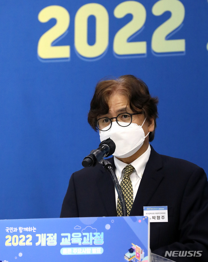 [세종=뉴시스] 강종민 기자 = 박형준 교육과정 개정추진위원장이 24일 오전 세종시 해밀초등학교에서 열린 2022 개정 교육과정 총론 주요사항 발표행사에서 개정 경과 및 주요 과제를 설명하고 있다. 2021.11.24. [email protected]