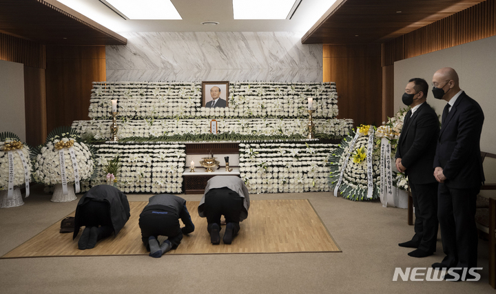 [서울=뉴시스] 조성우 기자 = 25일 오전 서울 서대문구 신촌 세브란스병원 장례식장에 마련된 고 전두환 전 대통령 빈소에서 전 전 대통령 장남 전재국, 차남 전재용(오른쪽 끝) 씨가 상주로 있는 가운데 조문객들이 절을 하고 있다. (공동취재사진) 2021.11.25. [email protected]