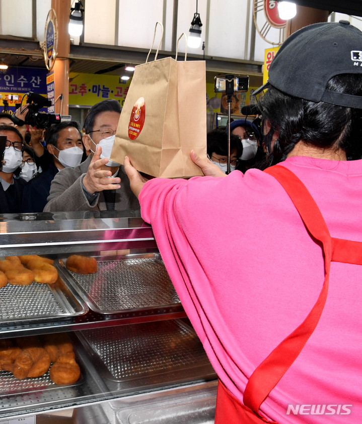 [목포=뉴시스] 변재훈 기자 = 이재명 더불어민주당 대선후보가 26일 전남 목포시 동부시장 내 청년상인이 운영하는 상가에서 꽈배기를 구입하고 있다. 이 후보는 세 번째 매타버스(매주 타는 민생버스) 일정으로 이날부터 3박4일간 호남 민심 탐방을 시작한다. 2021.11.26. [email protected]