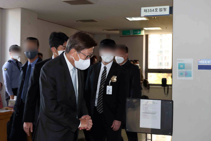 [부산=뉴시스] 하경민 기자 = 공직선거법 위반 혐의로 기소된 박형준 부산시장이 26일 오후 부산지법에서 열리는 첫 공판기일에 출석하기 위해 법정으로 들어가고 있다. 2021.11.26. [email protected]