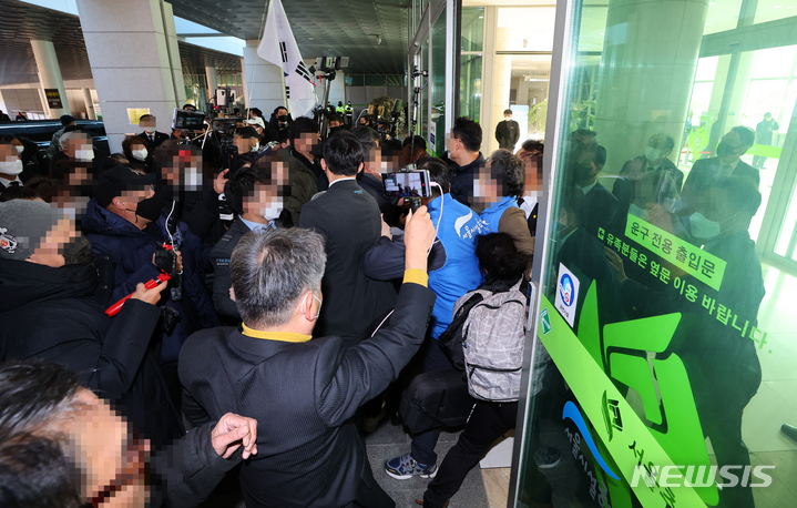 [서울=뉴시스] 조성우 기자 = 27일 오전 서울 서초구 서울추모공원에서 고 전두환 대통령의 운구가 들어가는 통로에 지지자들이 들어가려 하고 있다. (공동취재사진) 2021.11.27. [email protected]