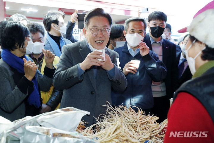 [장흥=뉴시스] 최동준 기자 = 이재명 더불어민주당 대선 후보가 27일 전남 장흥군 정남진장흥토요시장을 방문해 도라지차를 마시고 있다. 2021.11.27. [email protected]