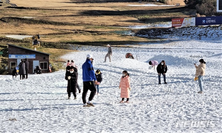 [횡성=뉴시스] 이덕화 기자 = 28일 강원 횡성군 소재 웰리힐리스노우파크가 인공 눈을 뿌리면서 내달 3일 개장을 준비하고 있는 가운데 아이들이 눈싸움을 하며 미리 찾아온 겨울을 만끽하고 있다. 2021.11.28. [email protected]
