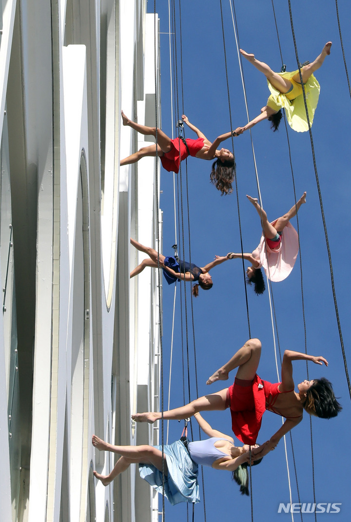 [부산=뉴시스] 하경민 기자 = 버티컬 댄스 공연팀인 '써드네이처'가 28일 오후 부산 수영구 광안리해수욕장 인근의 한 건물 외벽에서 밧줄 등을 이용해 곡예 무용 공연을 펼치고 있다. 버티컬 댄스는 등반 장비와 기술을 이용해 고층빌딩의 외벽, 암벽 등을 무대로 무용공연을 펼치는 예술 장르다. 2021.11.28. [email protected]
