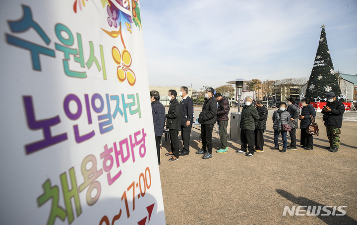 [수원=뉴시스] 정병혁 기자 = 29일 오후 경기 수원시 화성행궁광장에서 열린 제10회 수원시 노인일자리 채용한마당을 찾은 어르신들이 입장을 위해 줄 서 있다. 2021.11.29. [email protected]