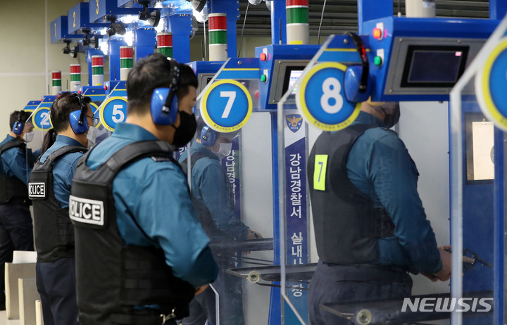 [서울=뉴시스] 백동현 기자 = 서울경찰청이 신임 경찰 현장대응력 강화 특별 교육을 실시한 가운데 1일 오전 서울 강남경찰서 실내사격장에서 신임 경찰관들이 사격훈련을 진행하고 있다. 2021.12.01. [email protected]